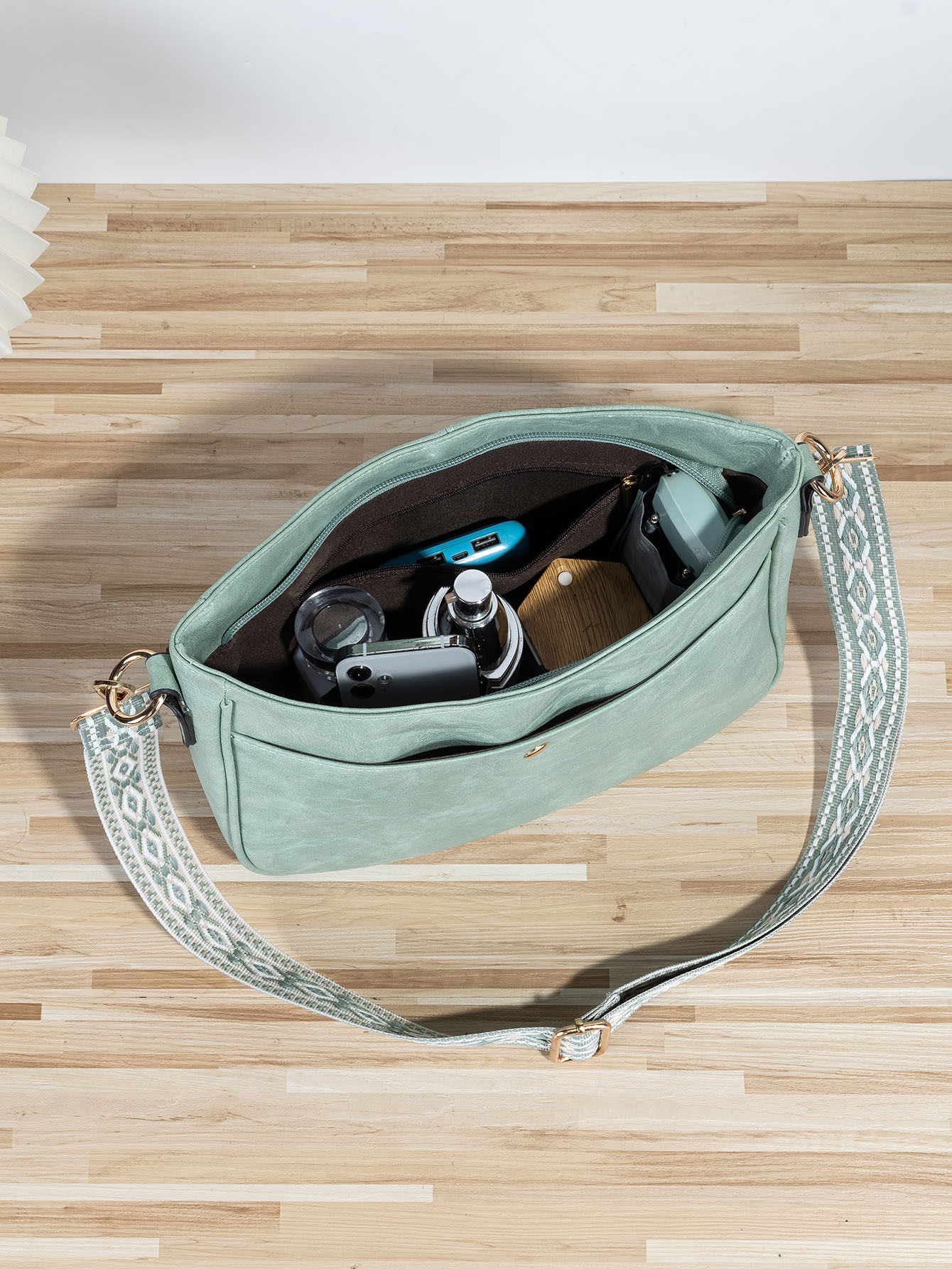 3. The extra long, detachable strap for wearing over the shoulder or cross-body.