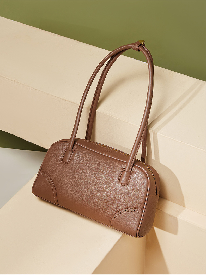 Genuine Leather Handbag Large Capacity Bowling Bag Brown
