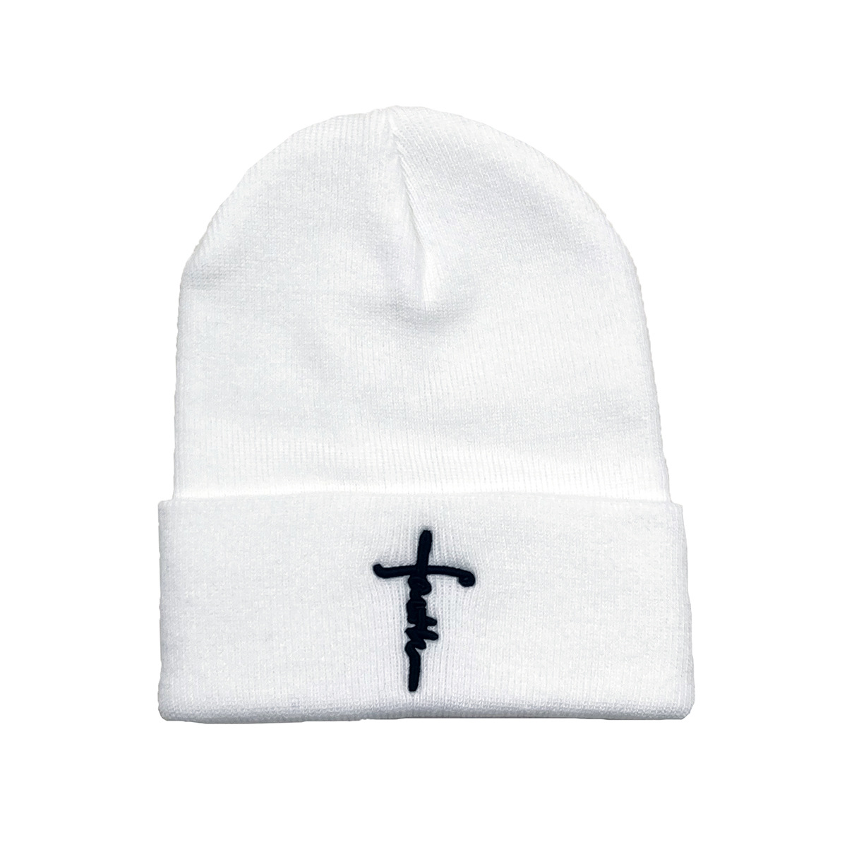 Cross Embroidered Hat Winter Warm Woolen Hat White