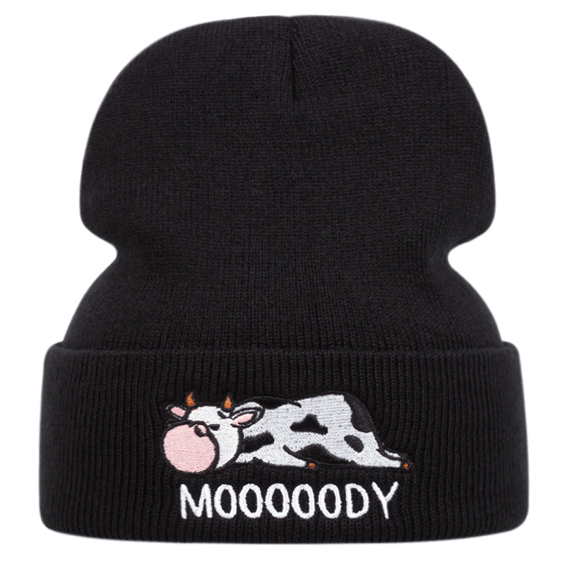 Embroidered Of COW Hat Winter Warm Woolen Hat Black