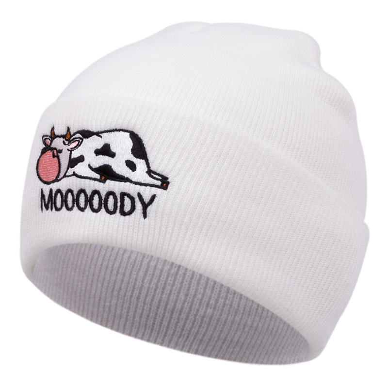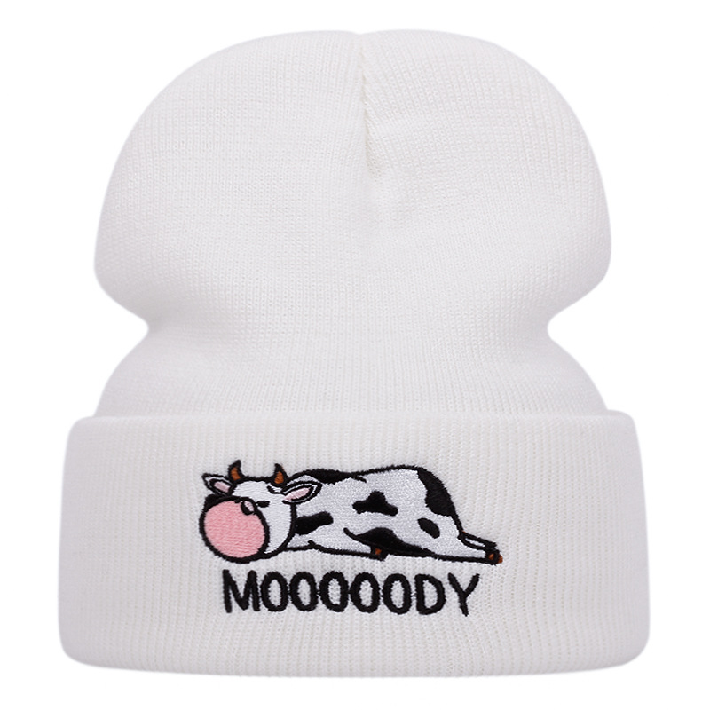Embroidered Of COW Hat Winter Warm Woolen Hat White