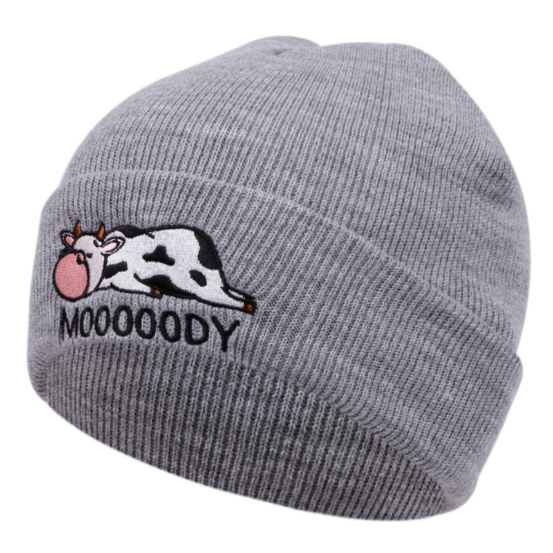 Embroidered Of COW Hat Winter Warm Woolen Hat Grey